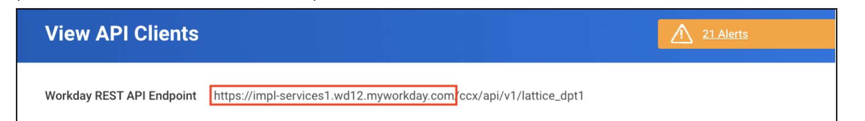 - Click Related Actions (ellipsis next to the name) > click View API Clients > View. Take note of the Workday REST API Endpoint (hostname portion) to be used in Lattice configuration later.